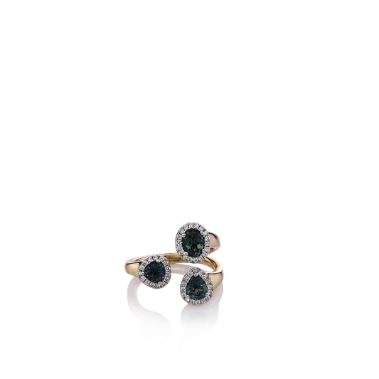 • 14k Yellow Gold Open Design Multi Shape Alexandrite and Diamond Halo Ring