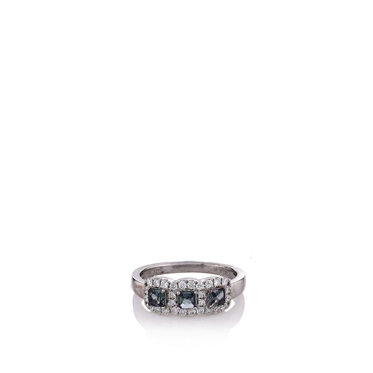 • 14k White Gold 3 Princess Cut Alexandrite and Diamond Halo Ring