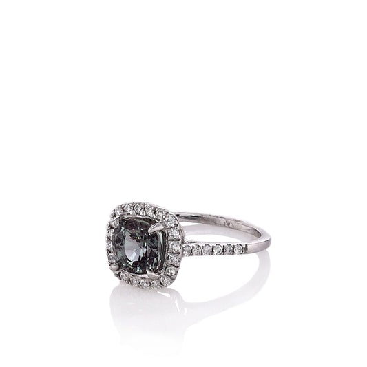• 14k White Gold Cushion Alexandrite Center and Diamond Halo Ring