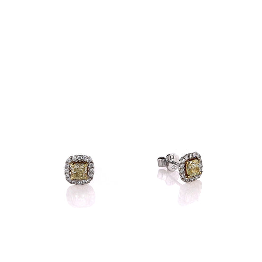 • 18k White Gold Yellow and White Diamond Halo Square Stud Earrings