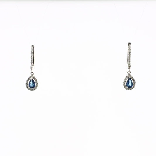 18k White Gold Pear Shape Sapphire and Diamond Halo Drop Earrings