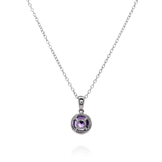 14k White Gold Round Amethyst and Diamond Halo Pendant Necklace