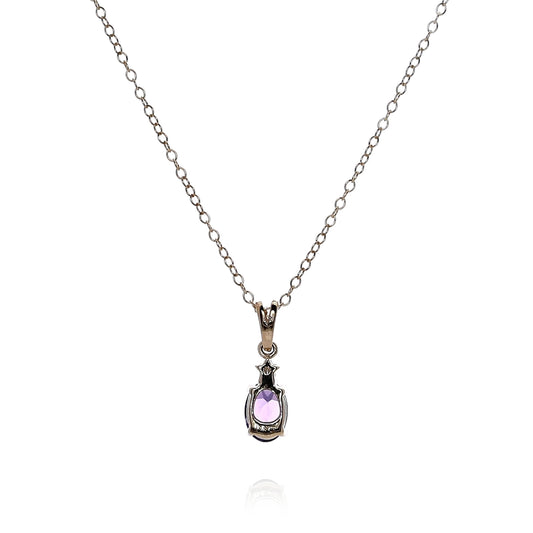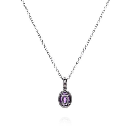 14k White Gold Oval Amethyst and Diamond Halo Pendant Necklace