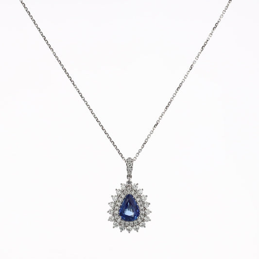 18k White Gold Pear Shape Sapphire and Diamond Double Halo Pendant Necklace