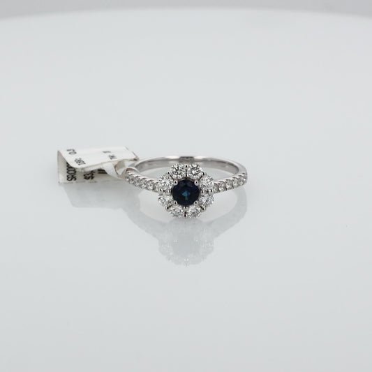 18k White Gold Sapphire and Diamond Halo and Shank Ring
