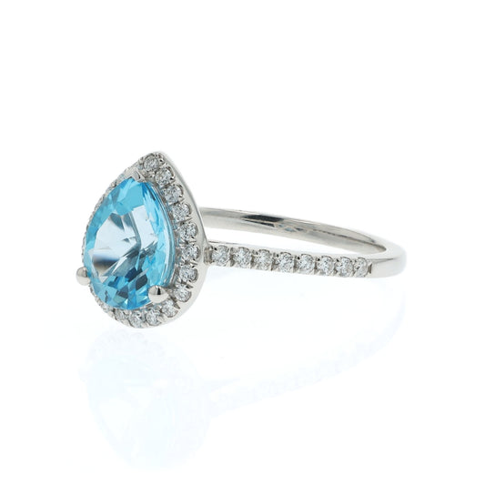 • 14k Gold Pear Shape Blue Topaz and Diamond Halo Ring