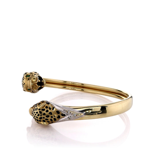 Estate 18k Yellow Gold Leopard Head Emerald and Diamond Bypass Bangle Bracelet