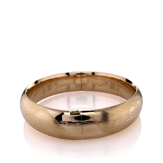 Estate 14k Yellow Gold Wide Polished and Engraved Leaf Motif Bangle Bracelet