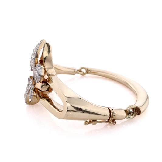 Estate 14 Karat Yellow Gold Fleur De Lis Design Hinged Diamond Bangle Bracelet