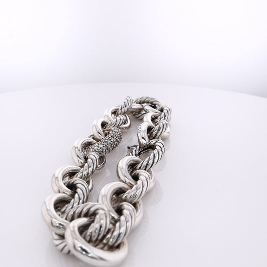 Estate David Yurman Sterling Silver Alternating Cable and Polished Diamond Oval Link Bracelk