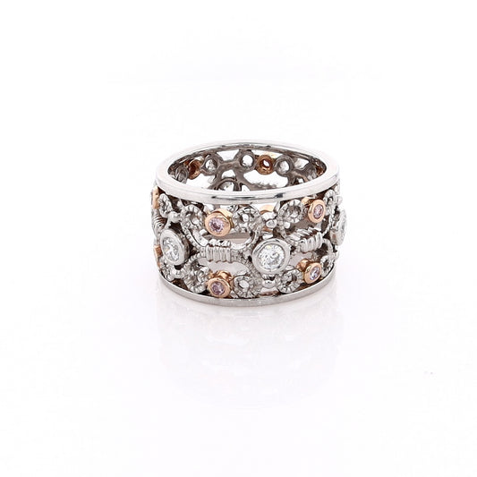 Estate Platinum and 18k Rose Gold Wide Band Open Scrollwork Diamond Ring