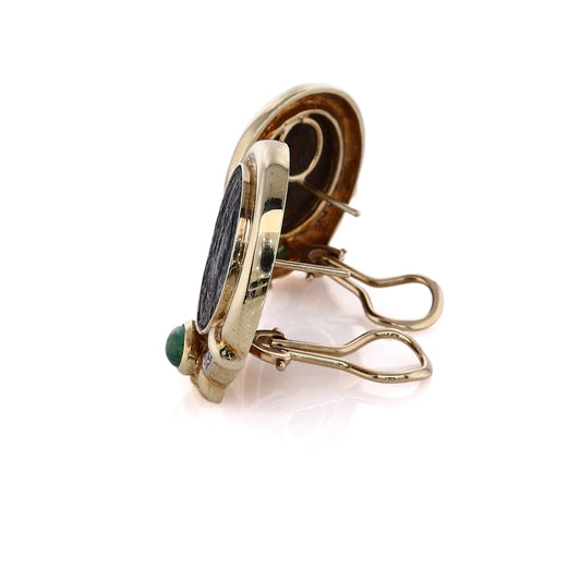 Estate 14 Karat Two-Tone Roman Coin Design Diamond and Emerald Earrings