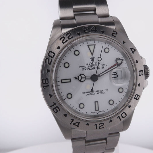 Estate Rolex Stainless Steel Oyster Perpetual Date Explorer II Polar White Dial 24 Hour Bezel 16570 With Box And Paper C.2000