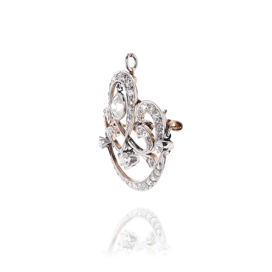 Estate 14 Karat Yellow Gold and Platinum with Scroll Design Diamond Brooch