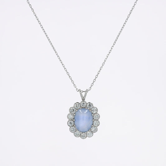 Estate 18k White Gold Oval Star Sapphire and Diamond Halo Pendant Necklace
