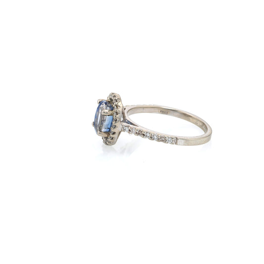 Estate 18k White Gold Engraved Shank Oval Sapphire and Diamond Halo Ring
