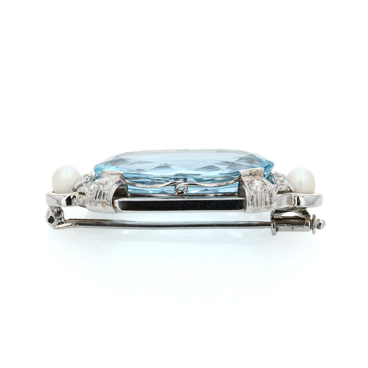 Estate 14k White Gold Oval Aquamarine, Pearl and Diamond Pin