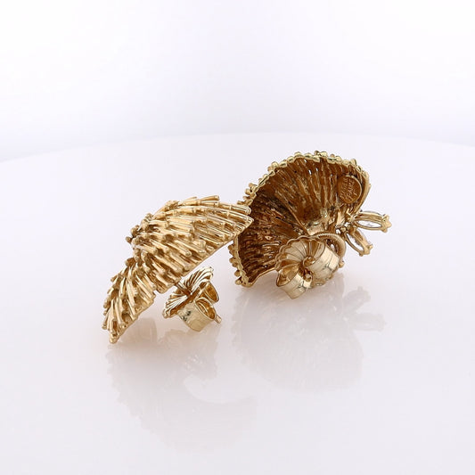 Estate 18 Karat Yellow Gold Textured Fan Design Diamond Earrings