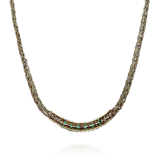 Estate 18k Yellow Gold Woven Chain Alternating Emerald and Diamond Necklace