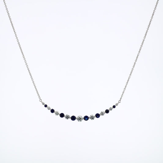 18k White Gold Alternating Graduated Sapphire and Diamond Curved Bar Pendant Necklace