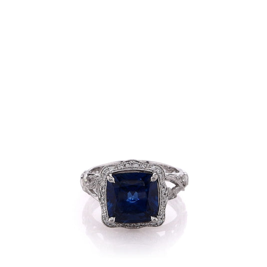 Estate Simon G Platinum Cushion Sapphire and Diamond Filigree Halo Ring