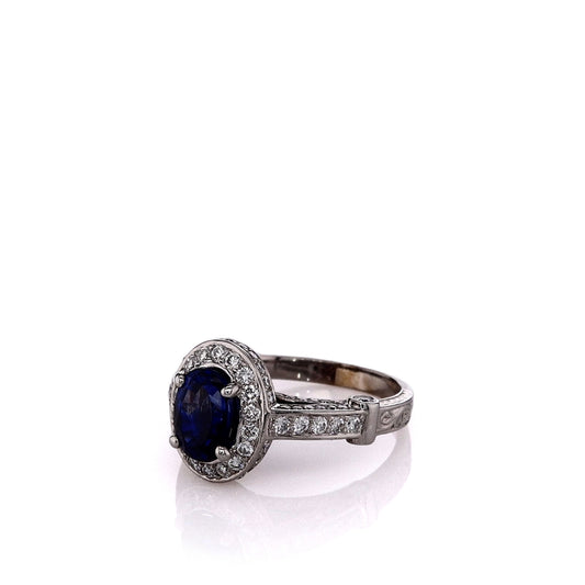 Estate 18k White Gold Engraved Shank Oval Sapphire and Diamond Halo Ring