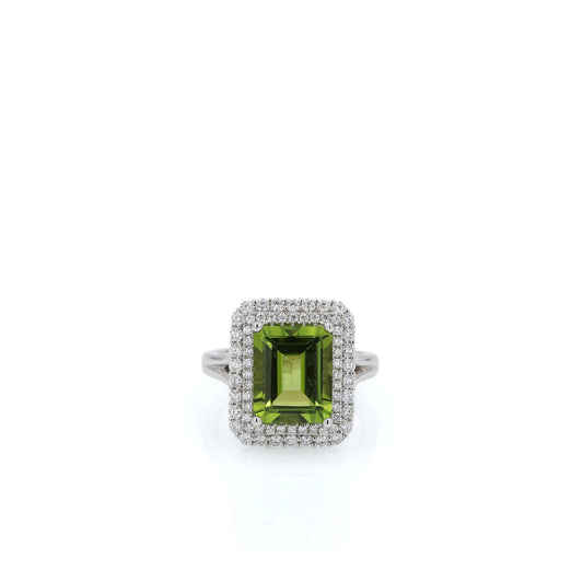 14k White Gold Emerald Cut Peridot and Diamond Double Halo Ring