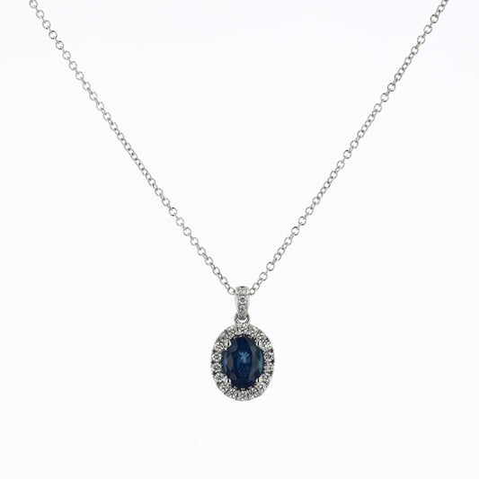 14k White Gold 1.42ct Sapphire and Diamond Halo Pendant Necklace
