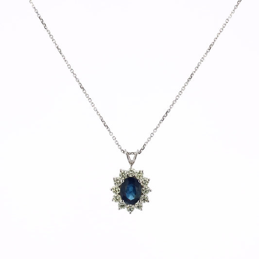 14k White Gold 16" Oval Sapphire and Diamond Halo Pendant Necklace