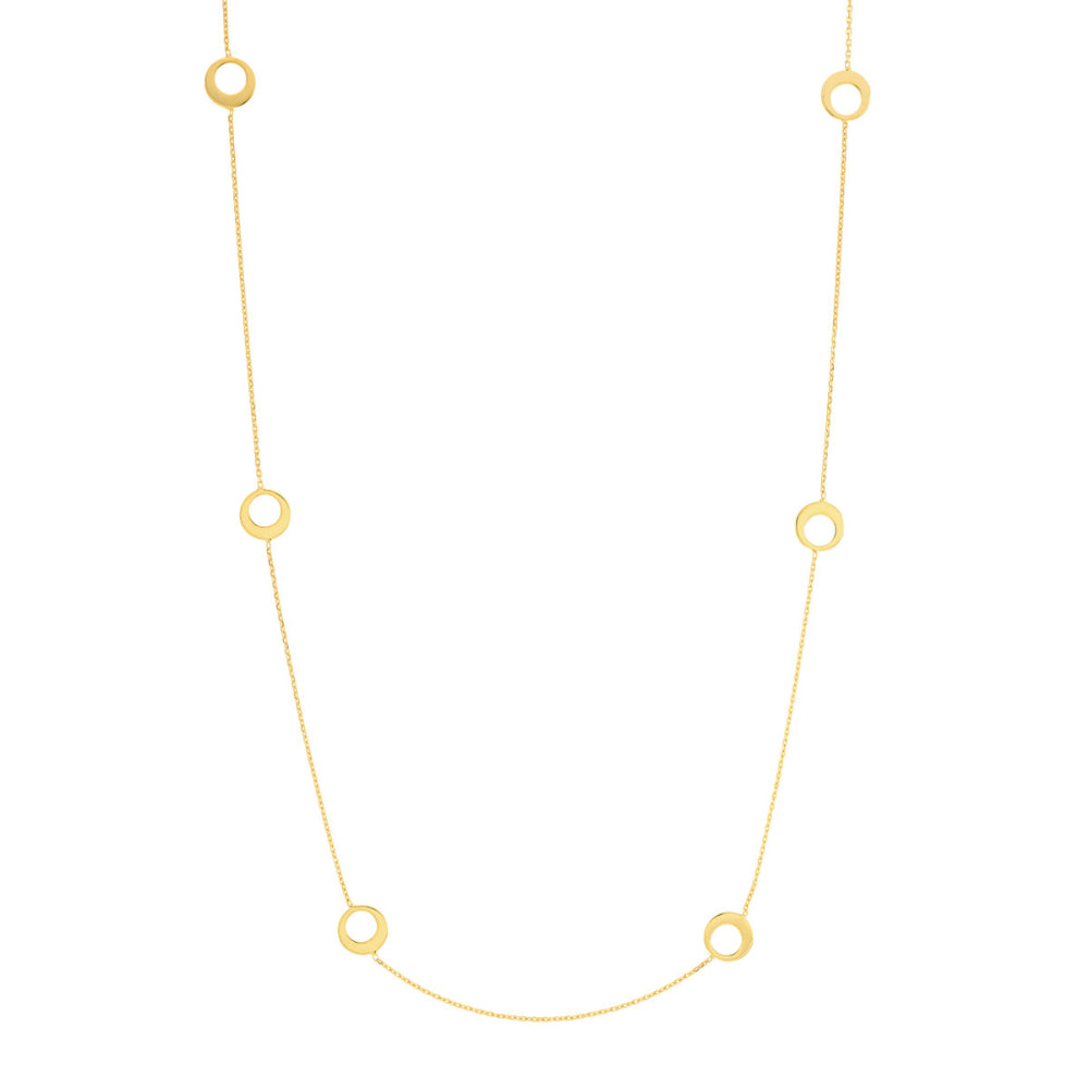 Make a sweet statement with an understated station necklace. This 14K yellow gold necklace features six delicate off-center open circles.