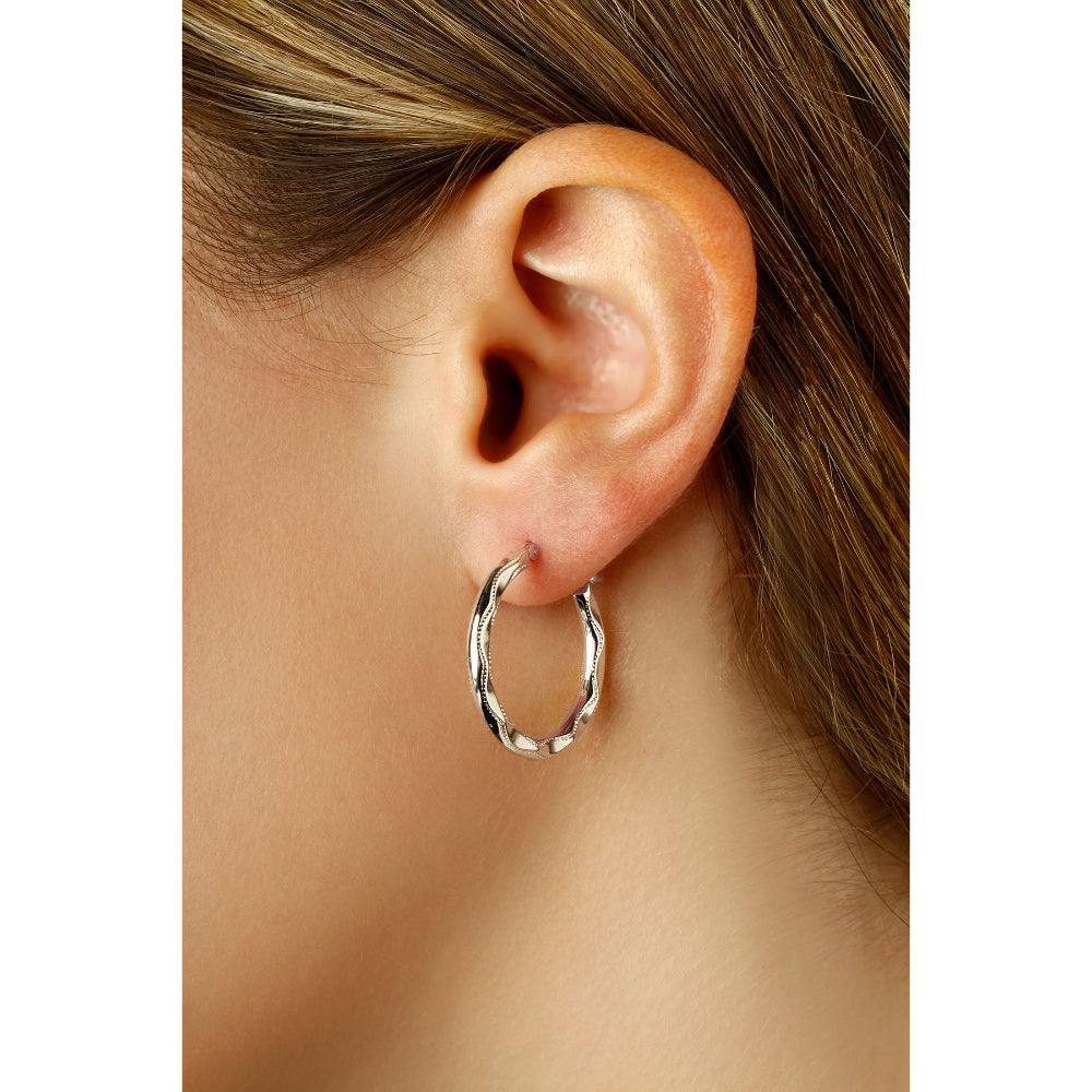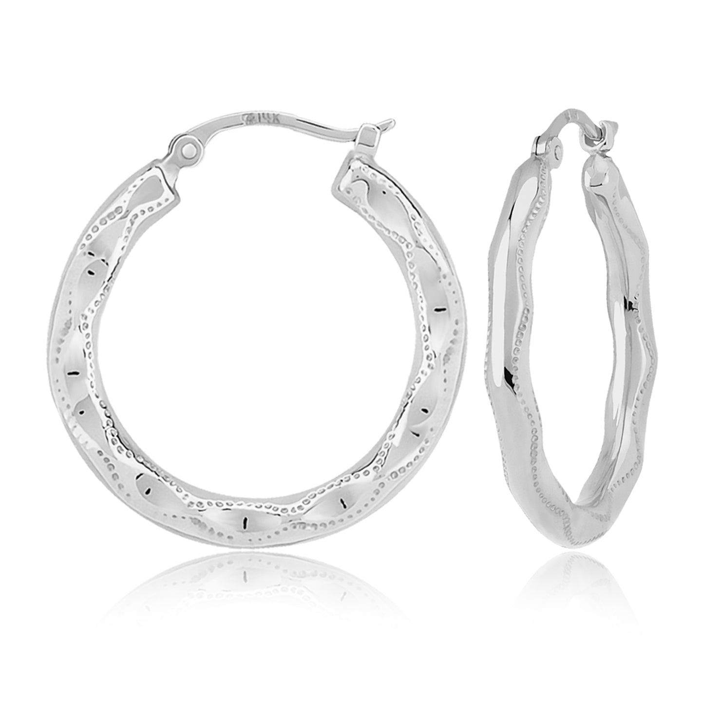 Introducing our elegant 14k White Gold Embossed Hoop Earrings, the perfect accessory to elevate any outfit.