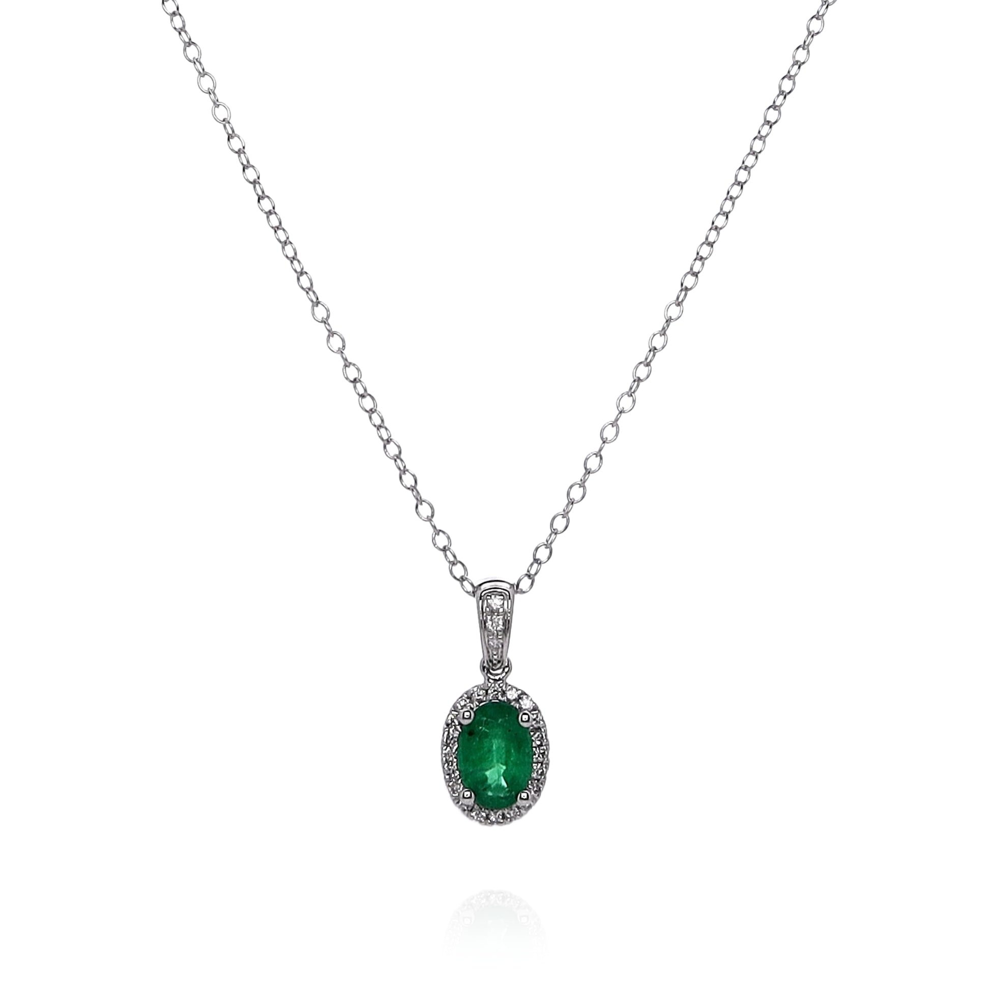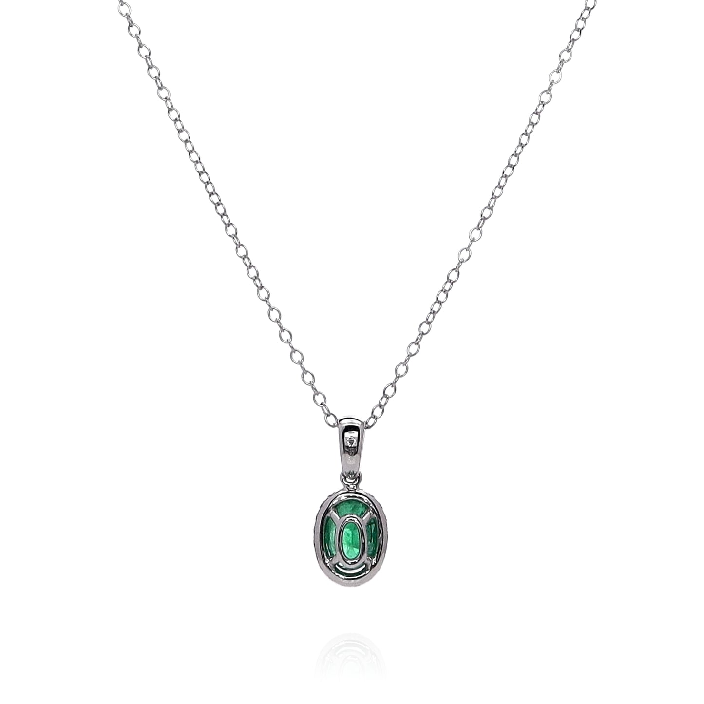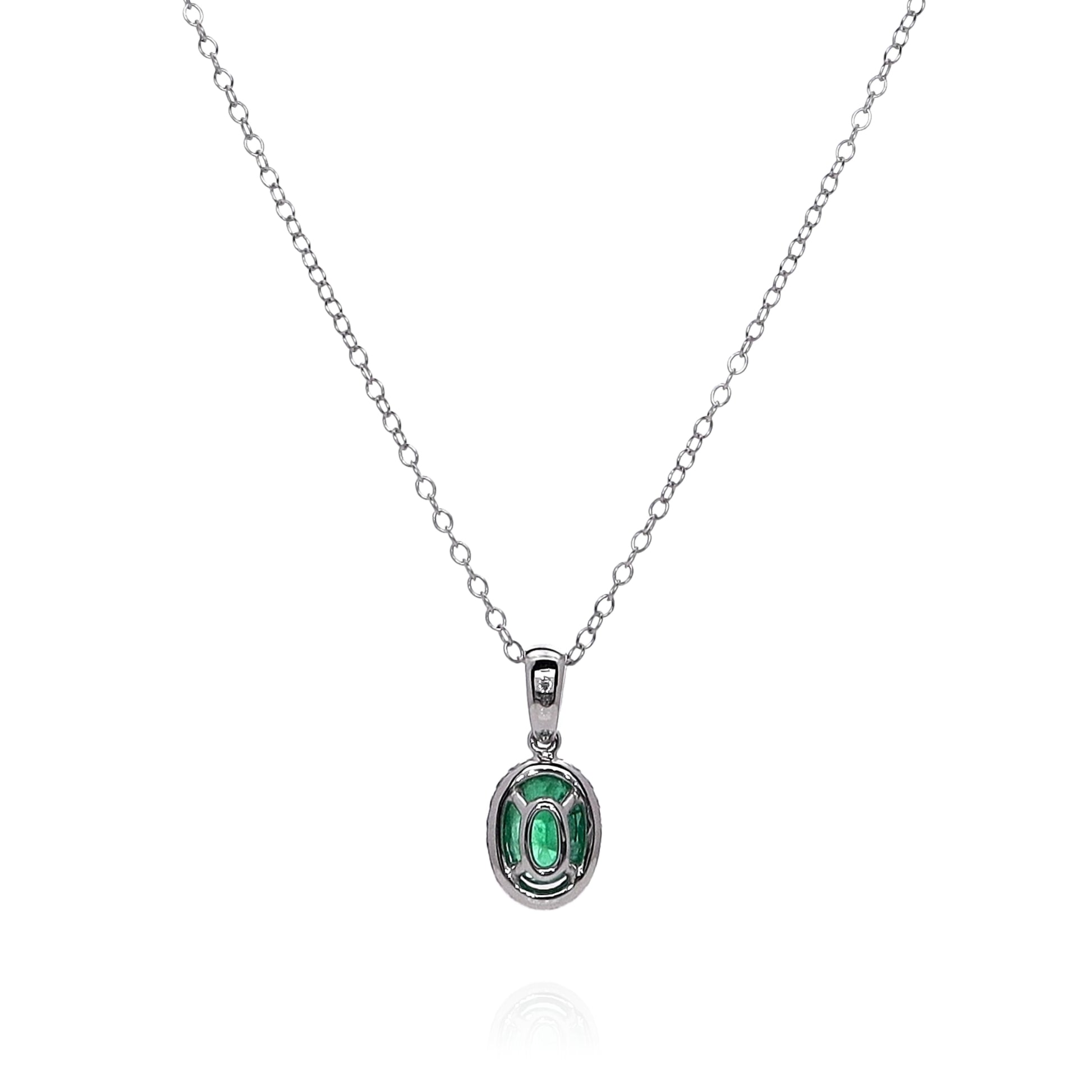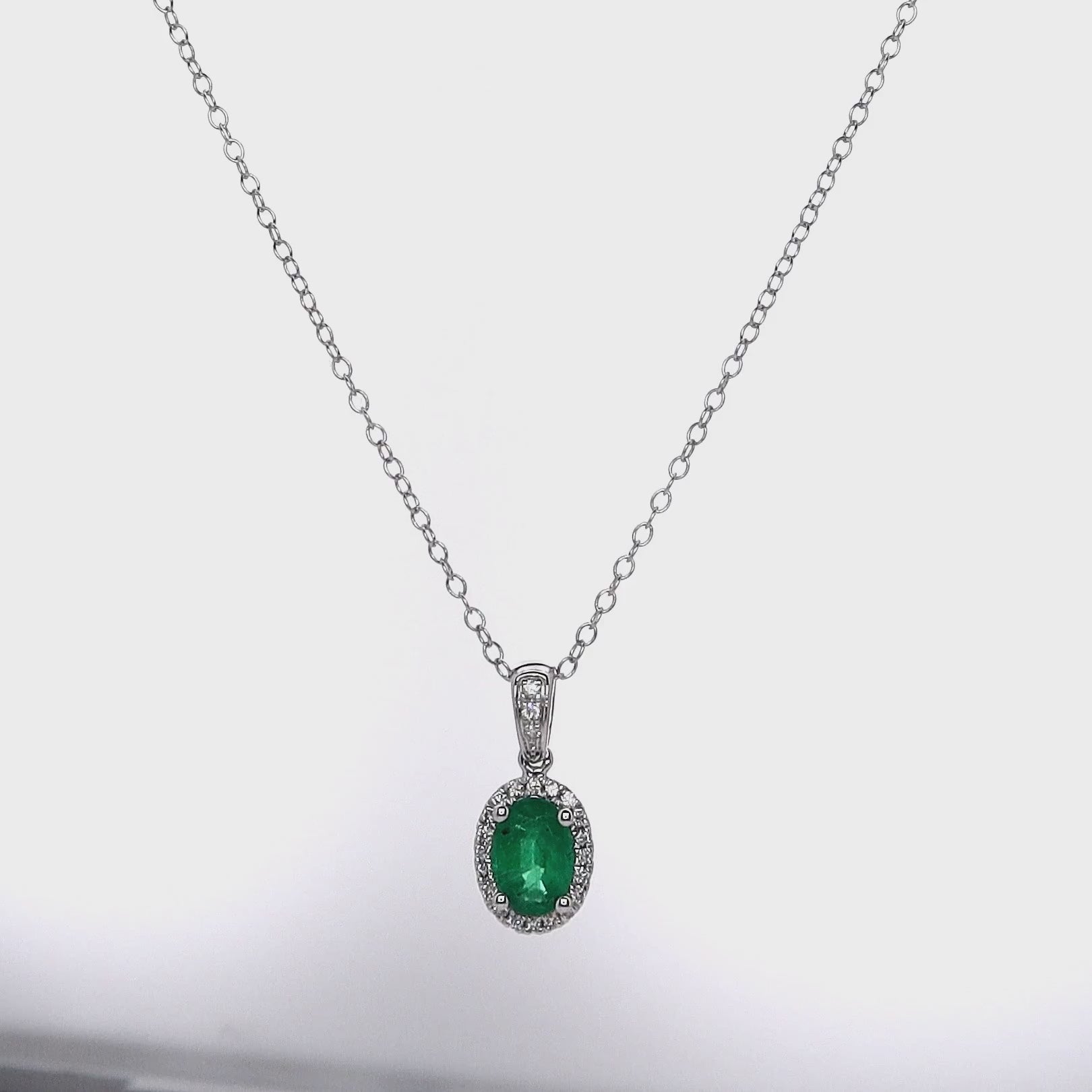 14k White Gold Oval Emerald and Diamond Halo Pendant Necklace