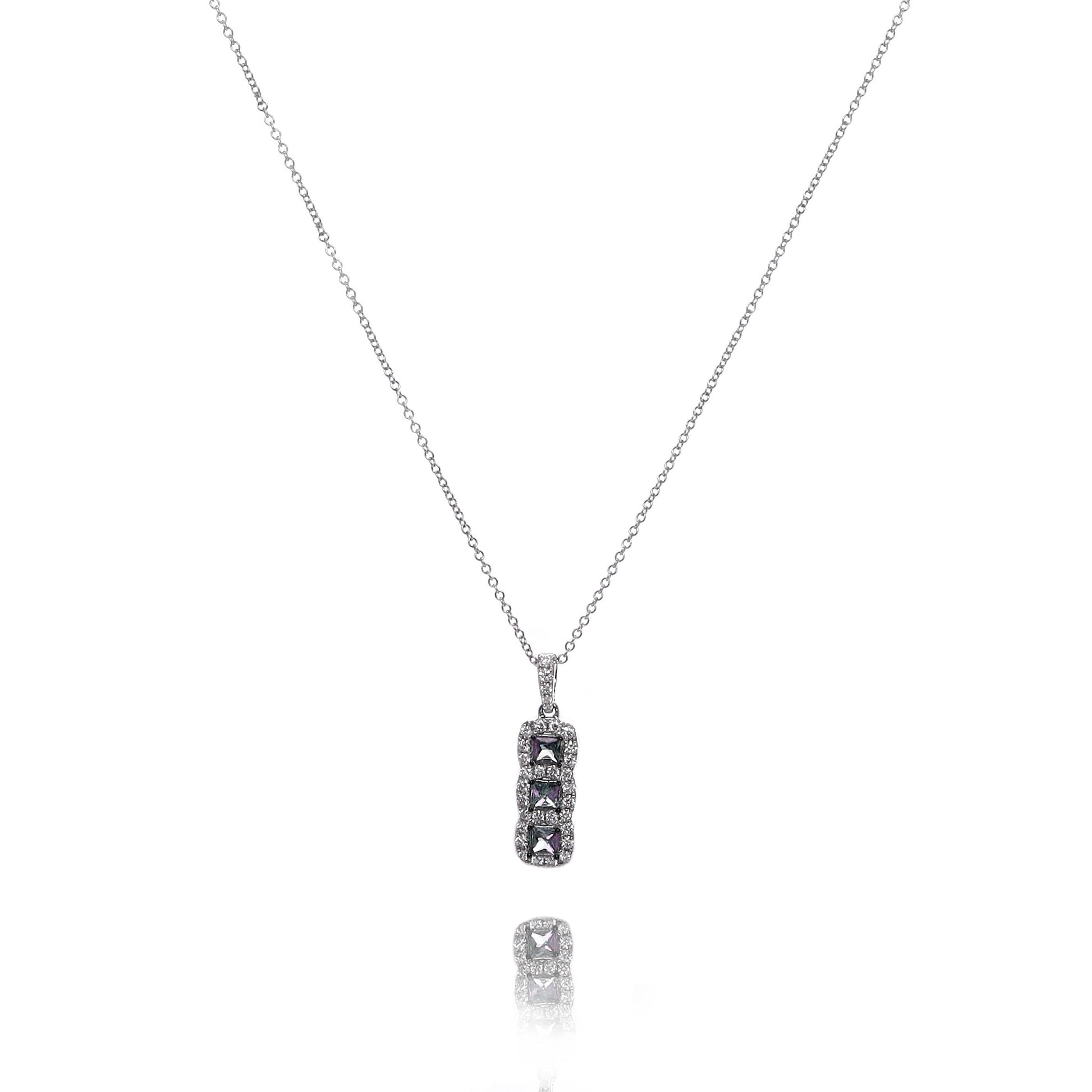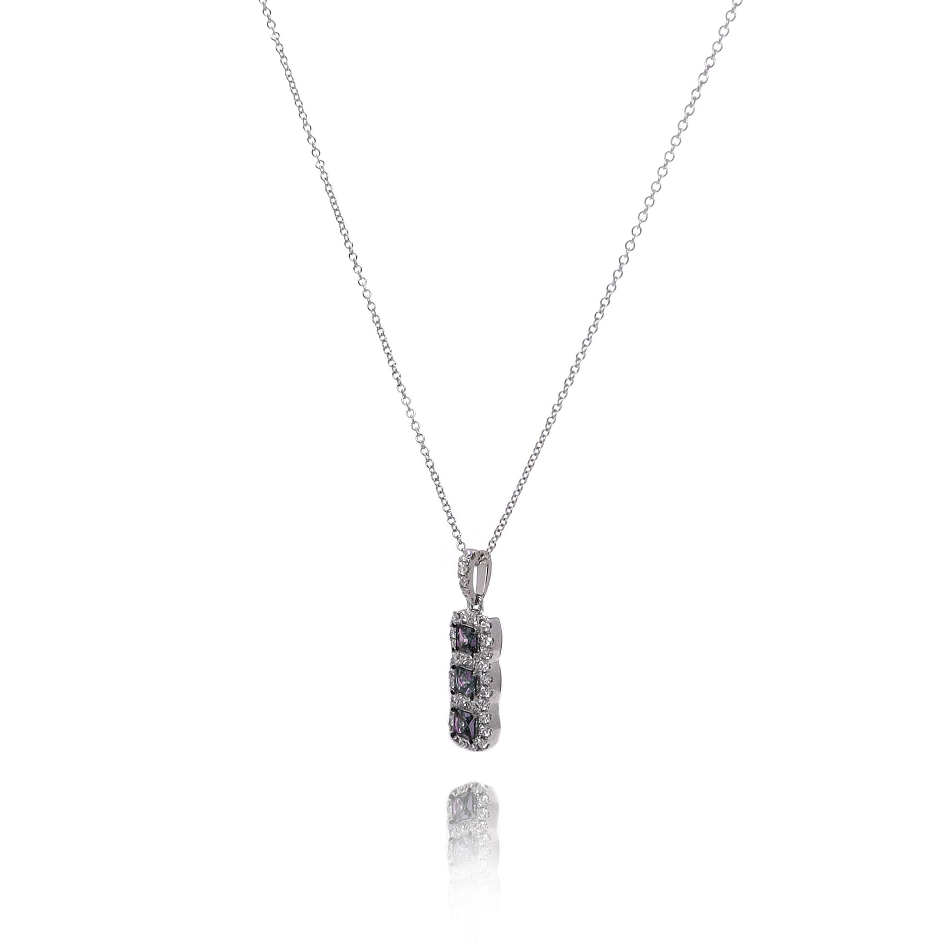 14k White Gold Princess Cut Alexandrite and Round Diamond Halo Pendant Necklace