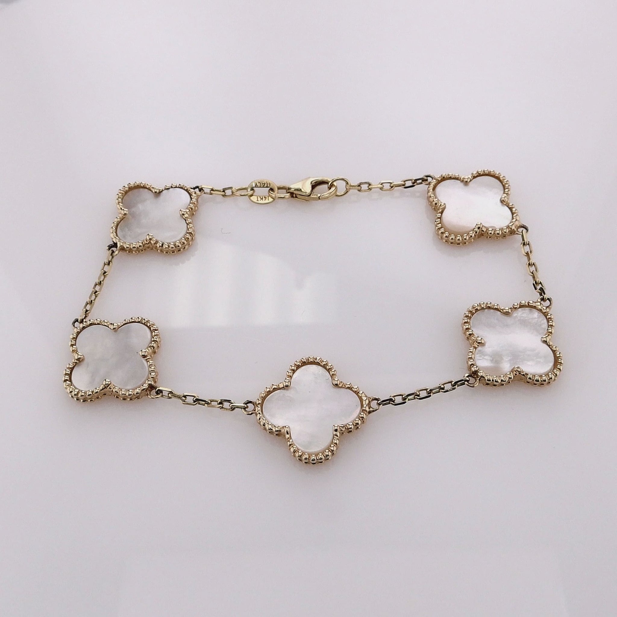 14k Yellow Gold 7.5" Mother of Pearl Clover Design Station Bracelet