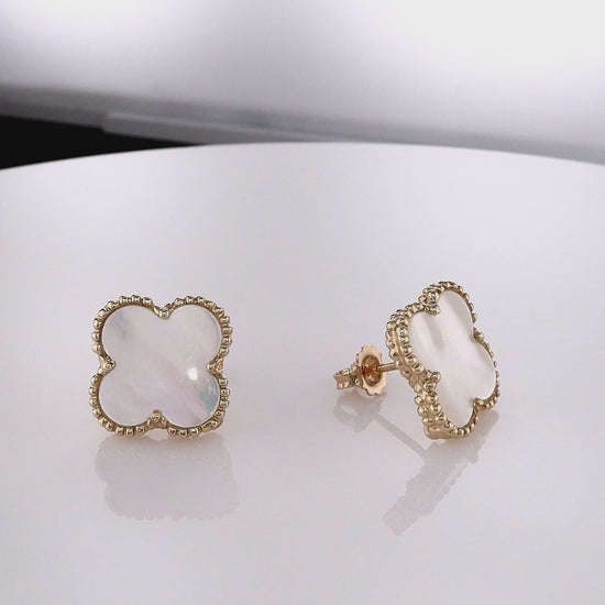 14k Yellow Gold Beaded Edge Mother of Pearl Clover Stud Earrings