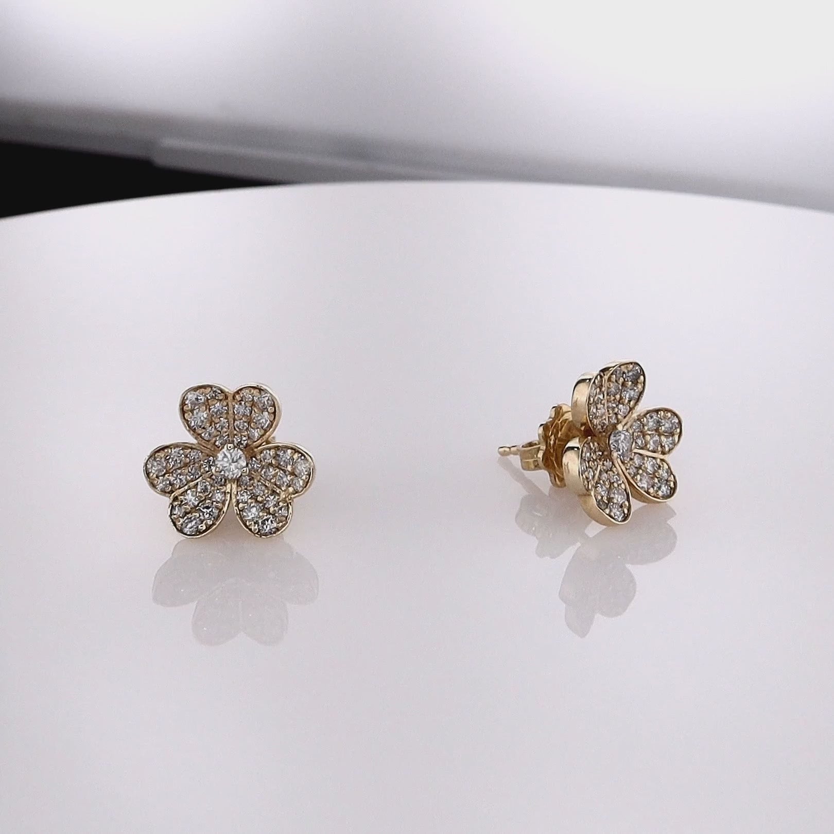 14k Yellow Gold Floral Clover Pave Stud Earrings