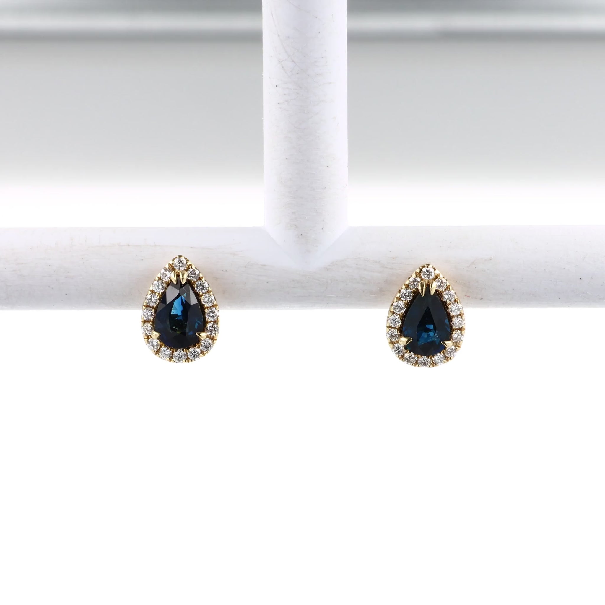 14k Yellow Gold Pear Shape Sapphire and Diamond Halo Stud Earrings