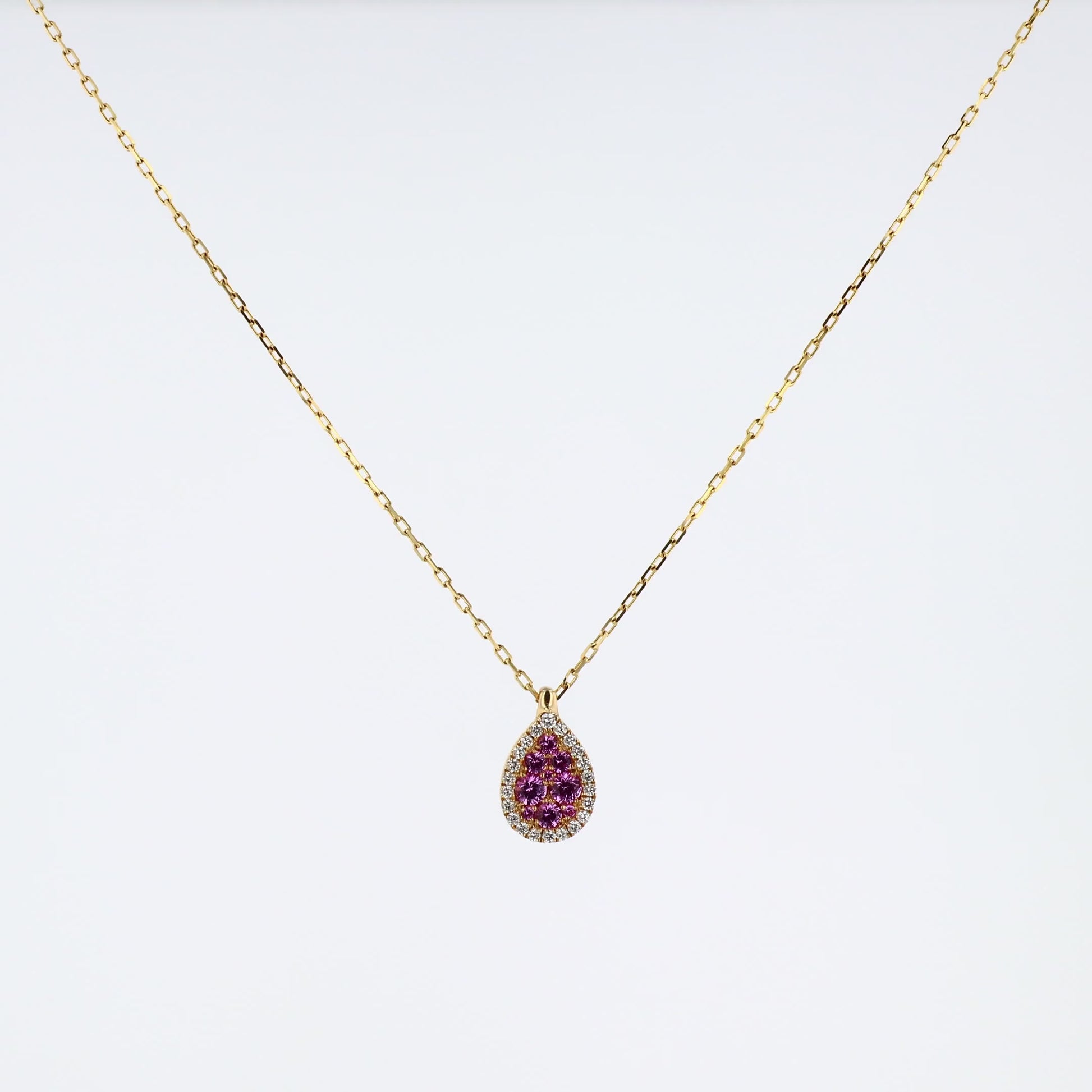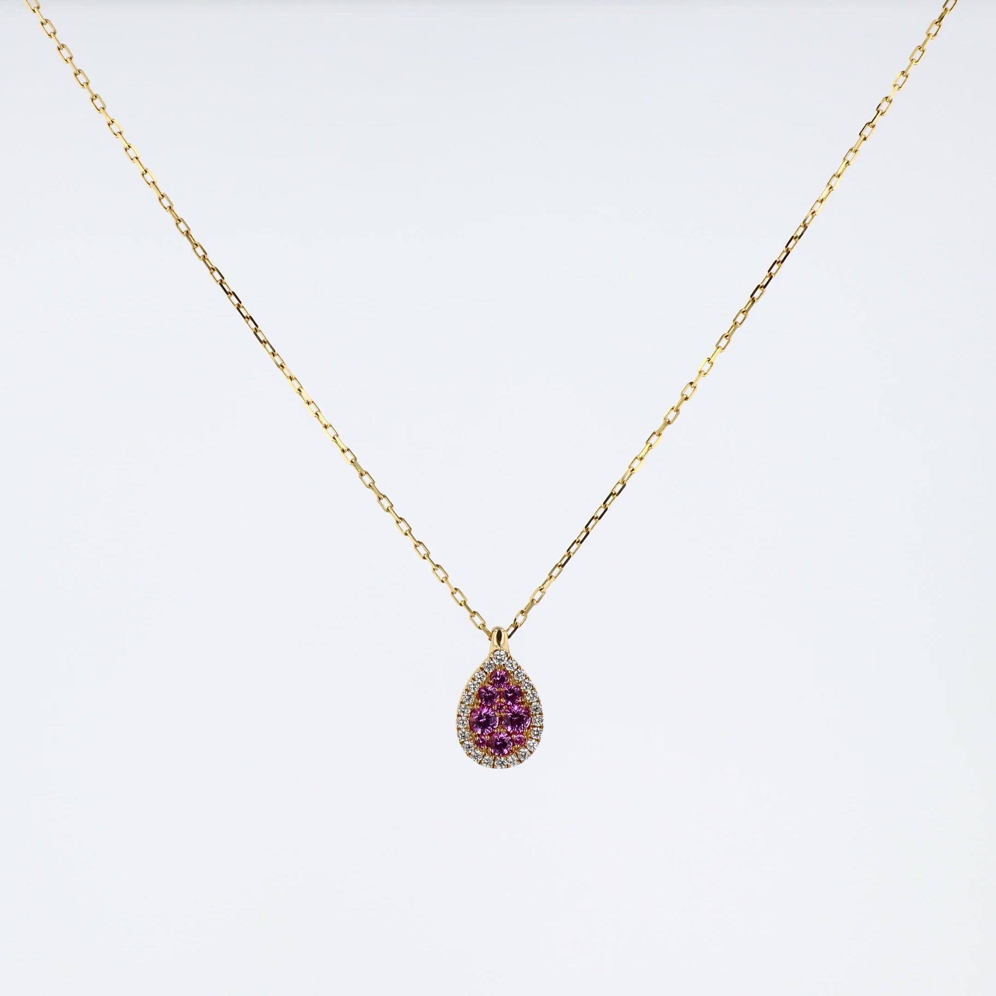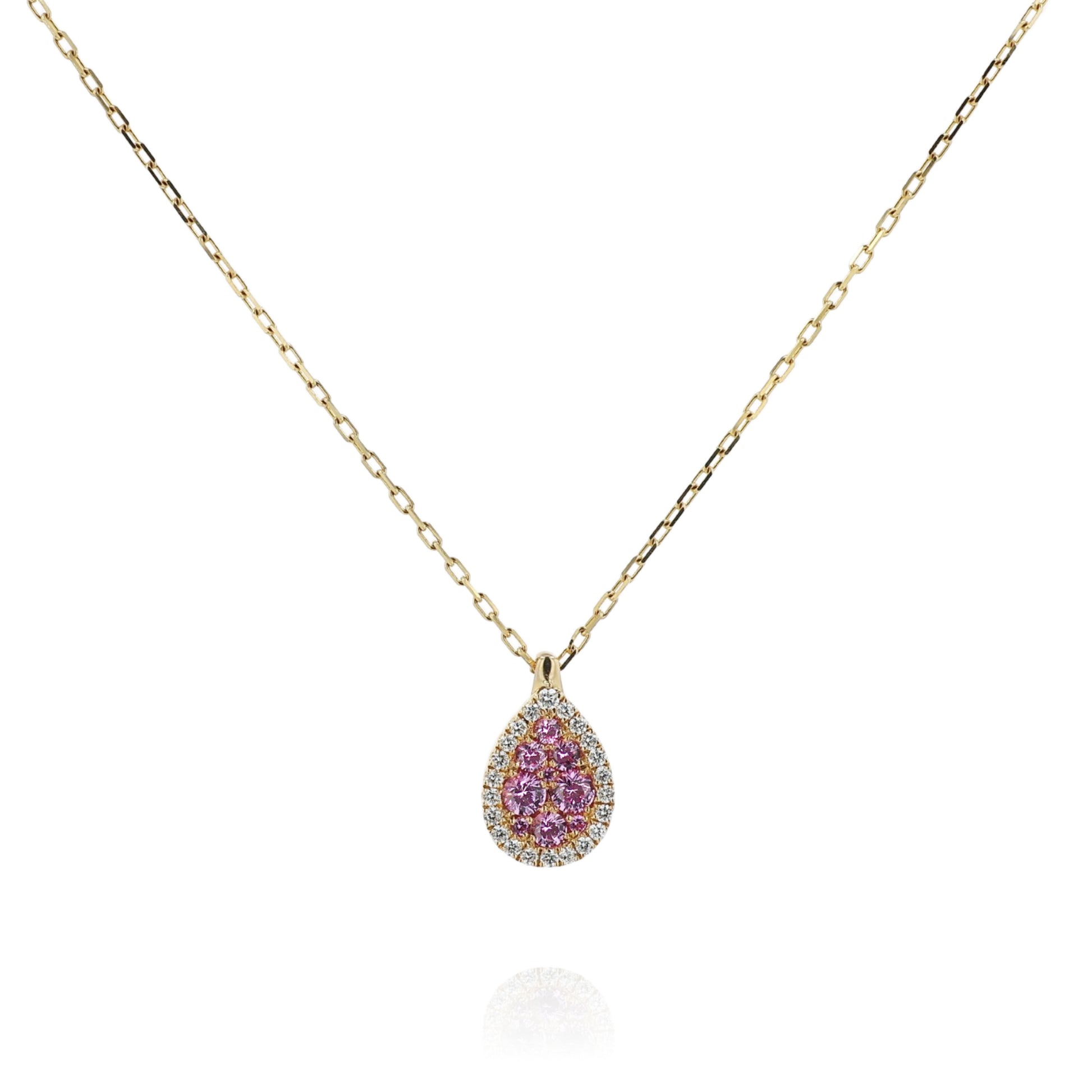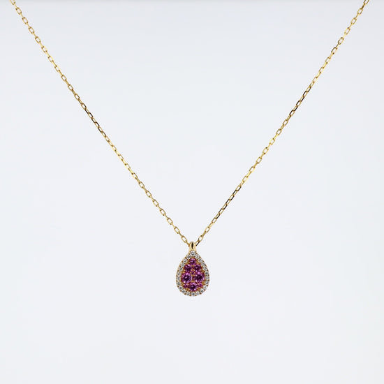 14k Yellow Gold Teardrop Shape Pink Sapphire and Diamond Halo Pendant Necklace