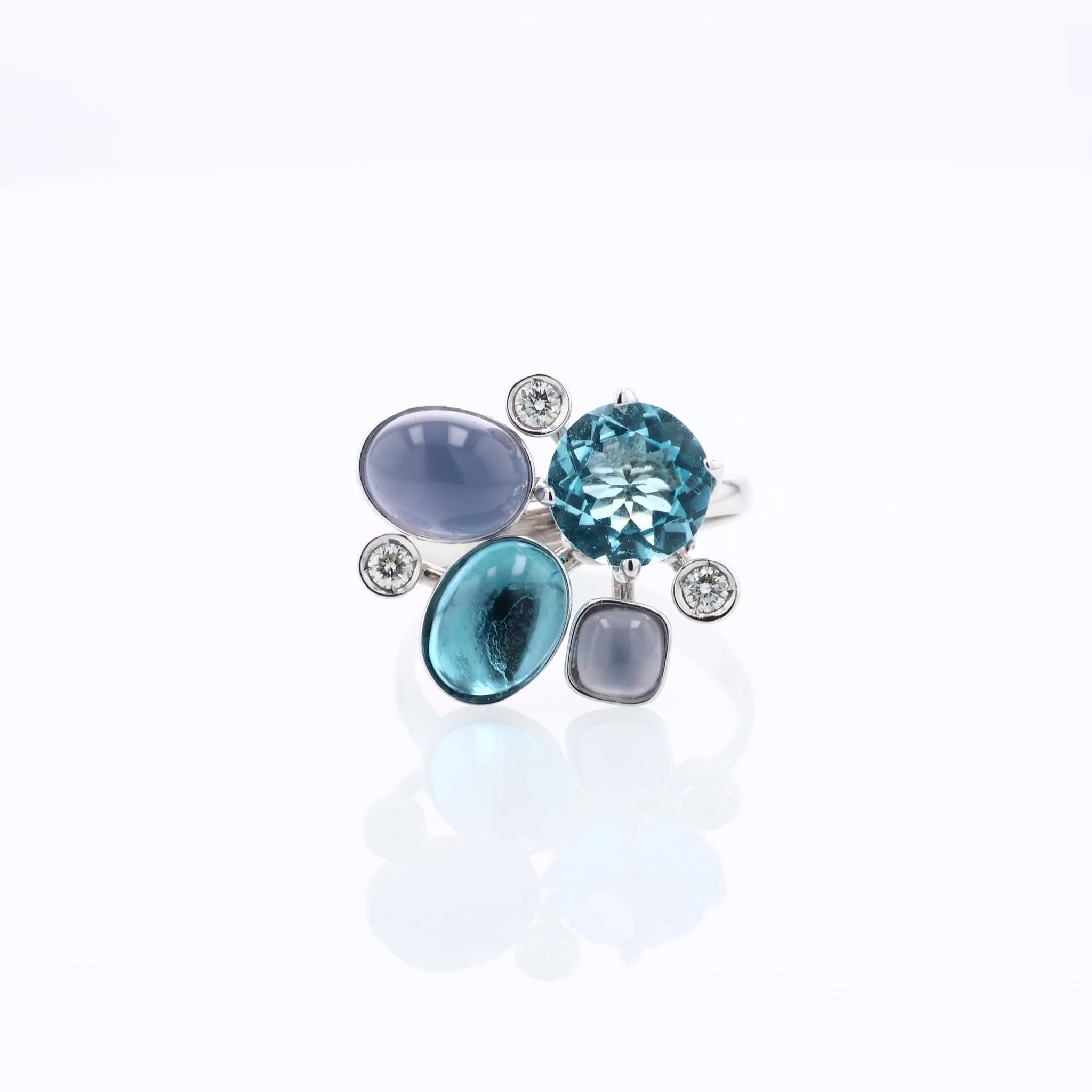18k Gold Blue Topaz, Quartz and Diamond Ring