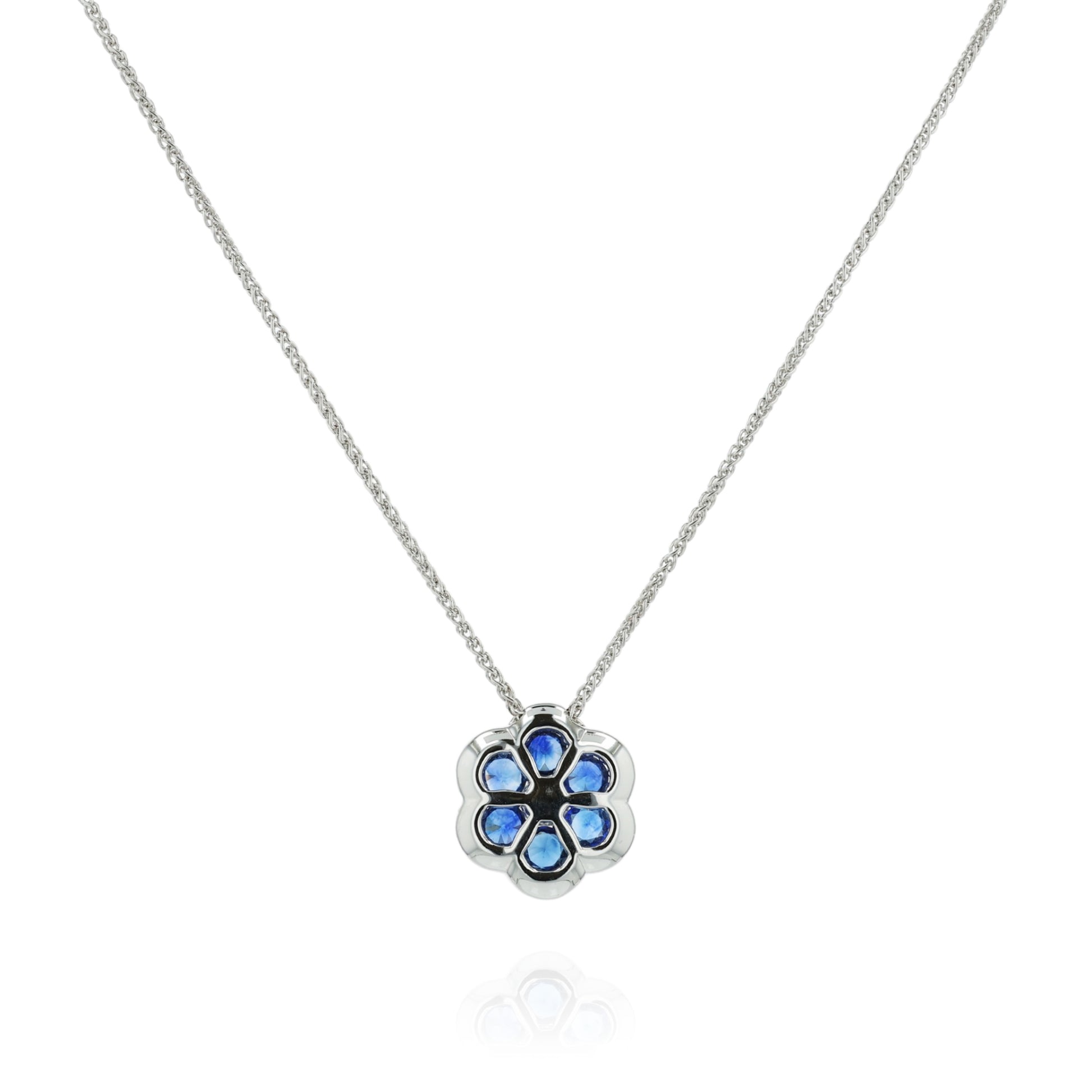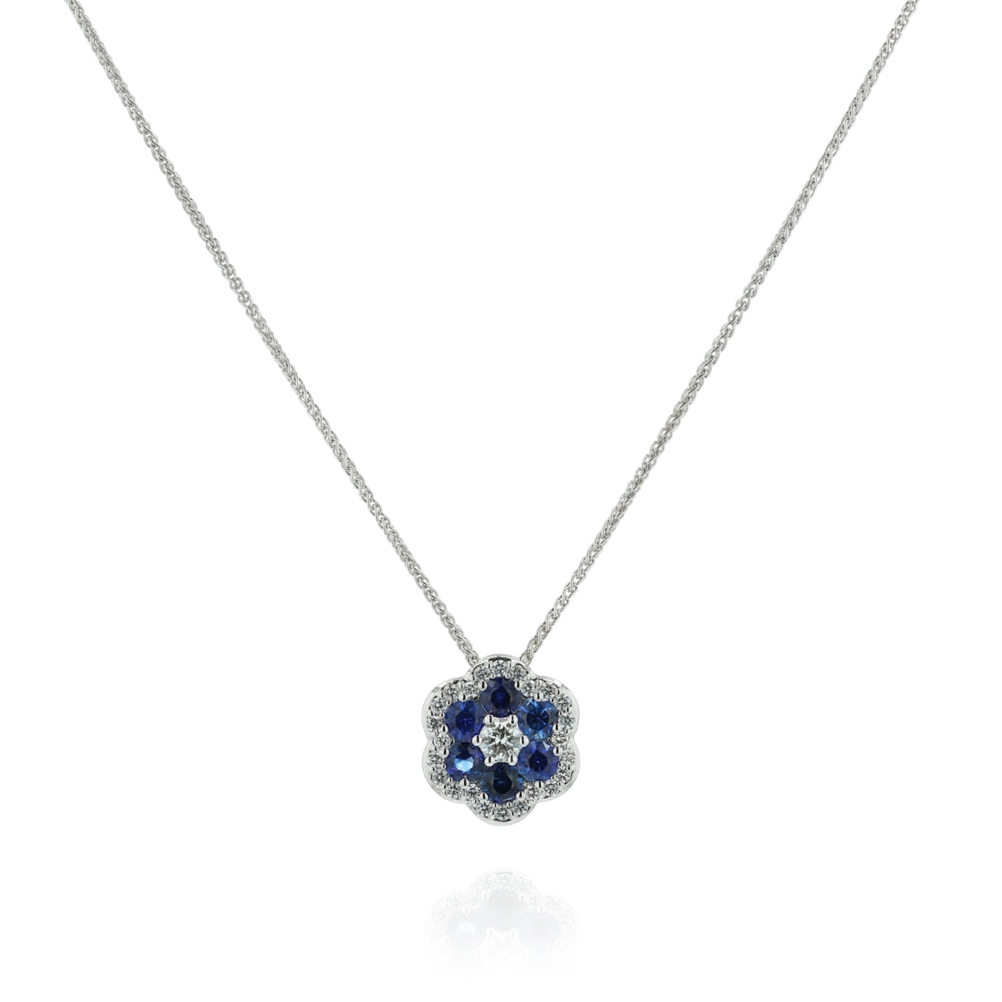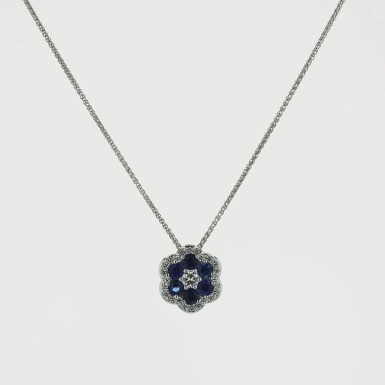 18k White Gold 18" Flower Shape Sapphire and Diamond Pendant Necklace