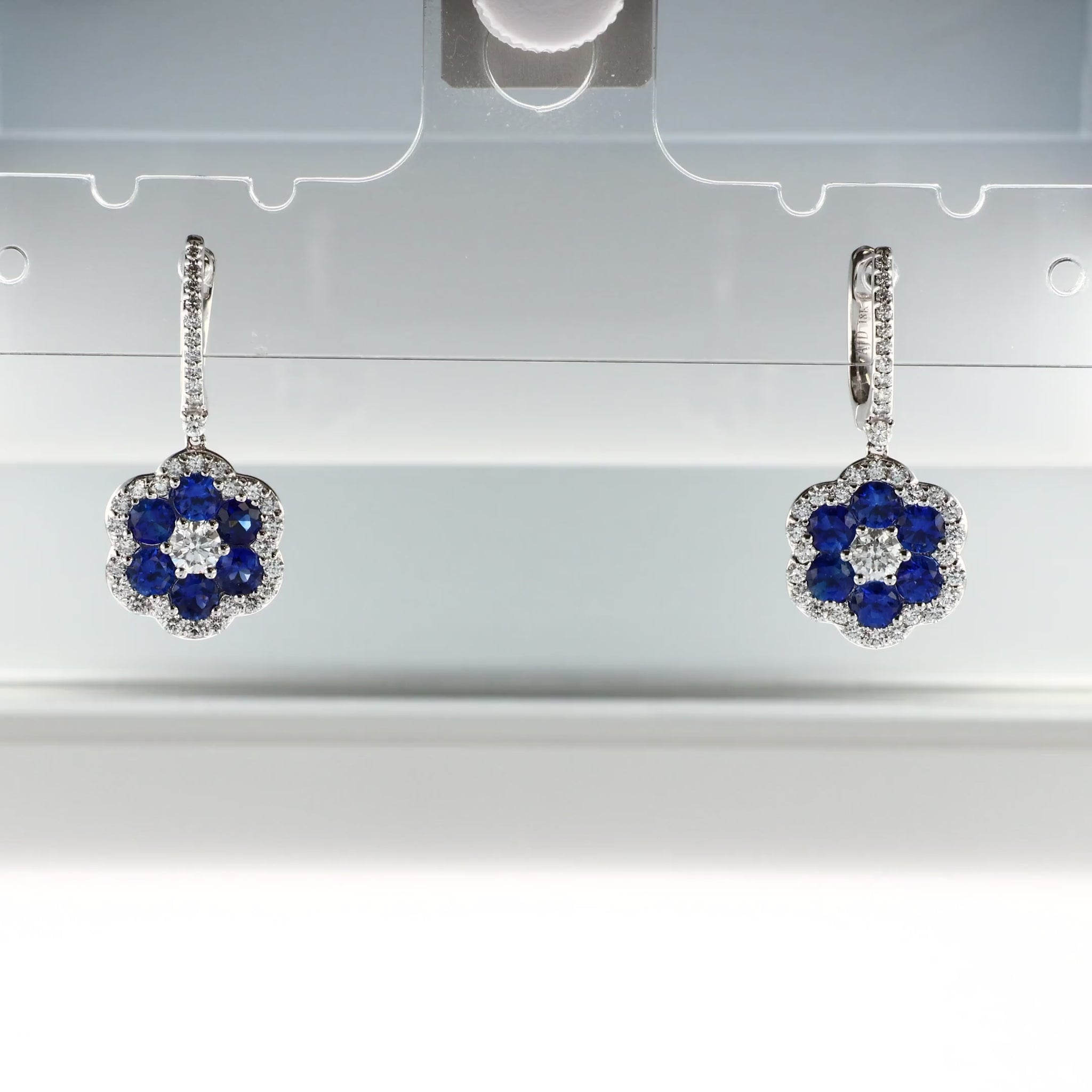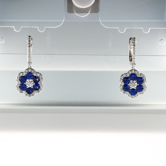 18k White Gold Flower Shape Sapphire and Diamond Halo Drop Earrings