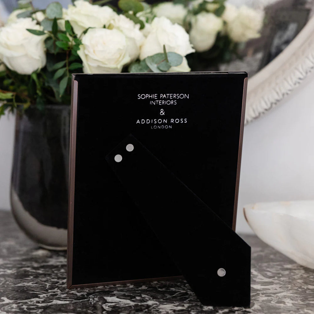 In collaboration with Sophie Paterson, this rattan frame is a marriage of tactile woven textures in a beautiful shade of natural wheat encased in a luxurious bronze frame. Finished with a slide in black velvet back stand, able to stand both portrait and landscape and beautifully gift boxed.