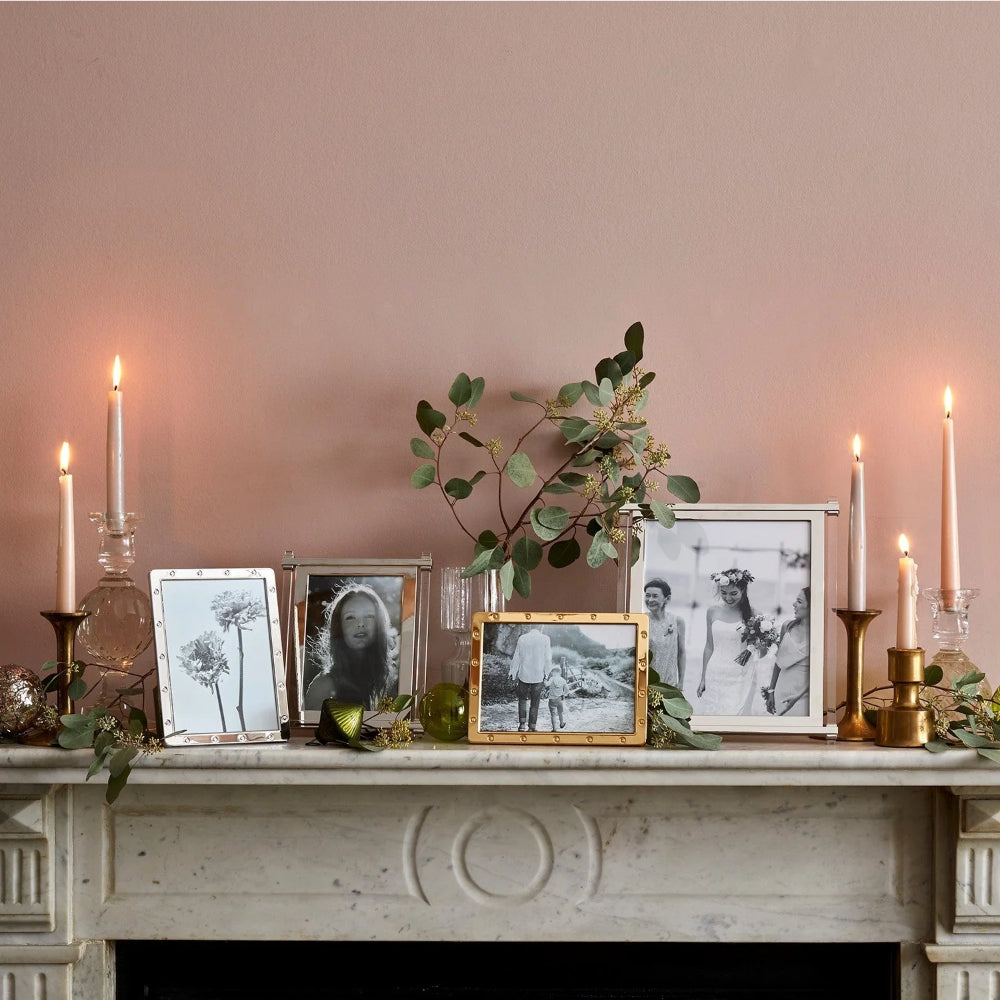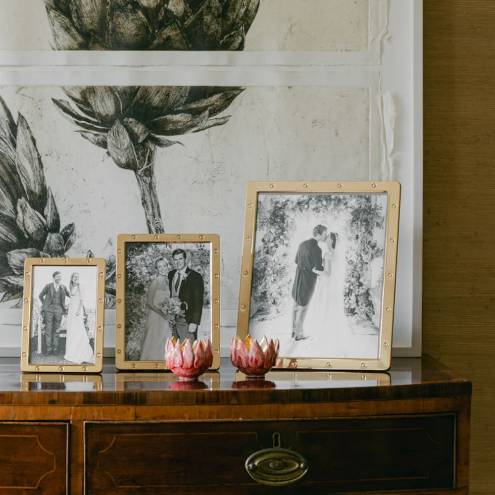 A beautiful gold plated frame with screw detail, curved corners and a beautiful dove grey velvet backstand.