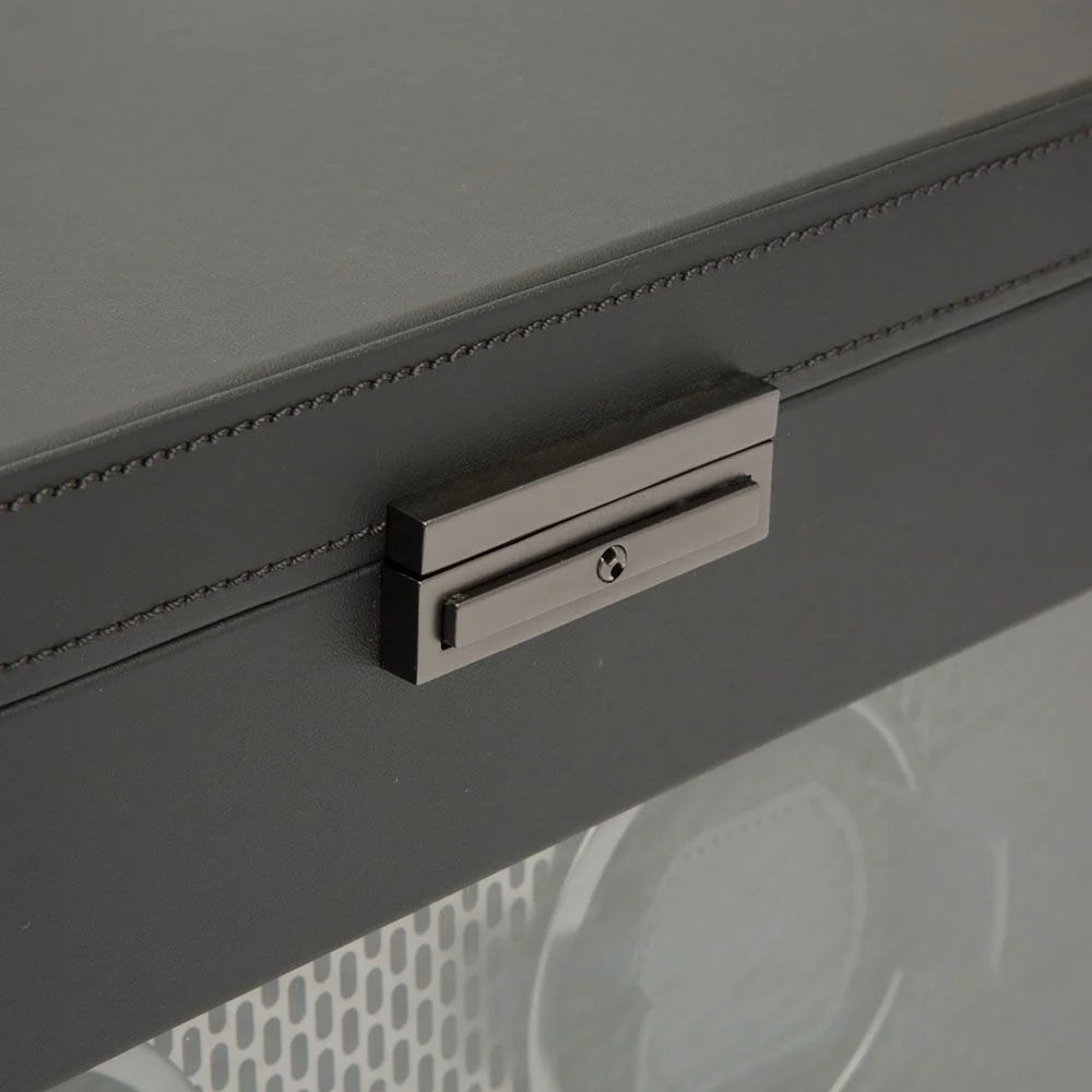Powder-coated laser cut perforated steel melded with clean, sleek lines. AXIS drives a modern, bold look for safekeeping your timepieces. Trusted advanced technology of counting rotations of the axis of your watch guarantees precise turns per day. Bold luxury, faultless design, take AXIS for a spin. Features locking glass cover, backlit LCD display, matte chrome finished hardware and 2 winding modules with storage.