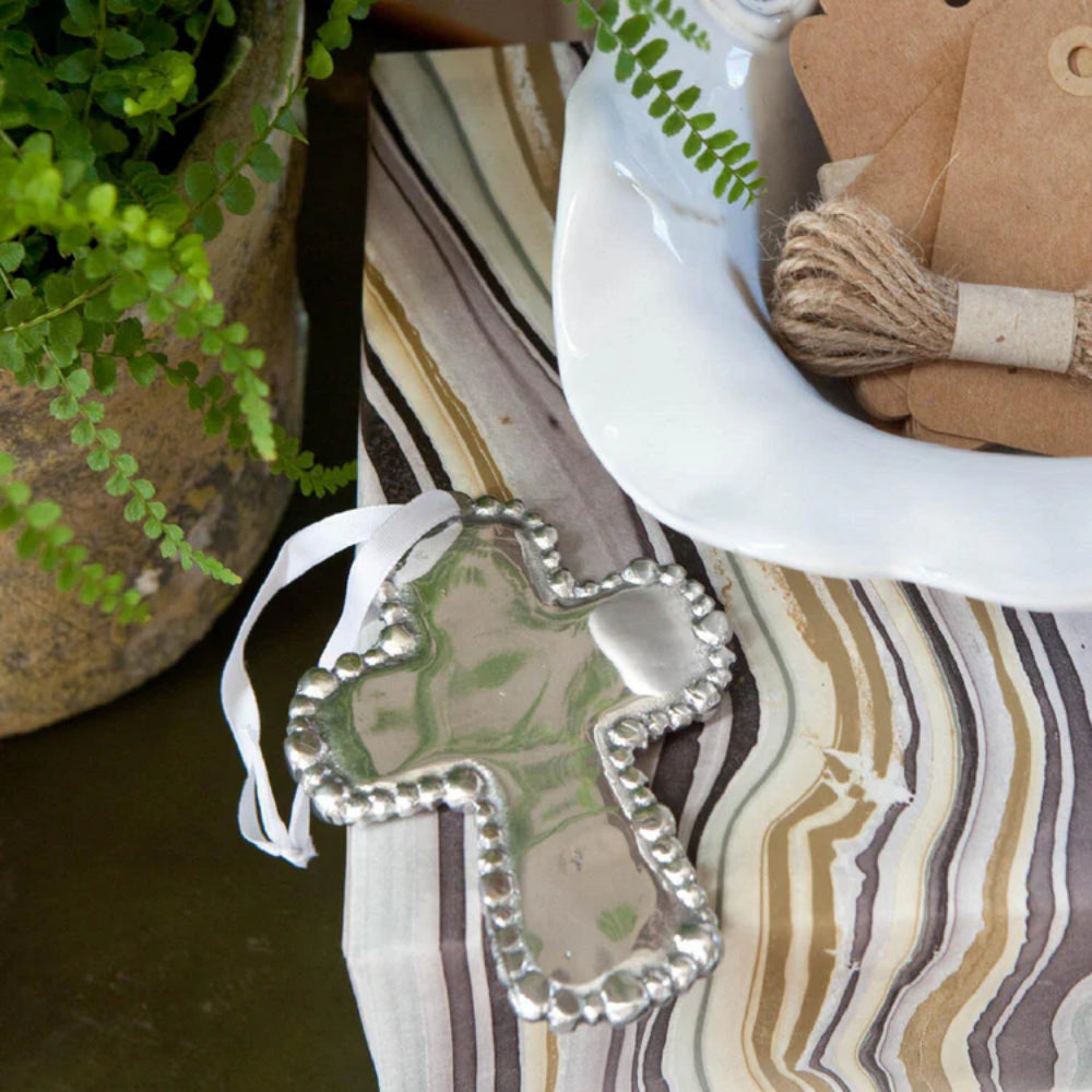 The Beatriz Ball BABY ORGANIC PEARL ATHENS cross ornament is composed of tarnish free decorative metal and rimmed with shimmering metal pearls.