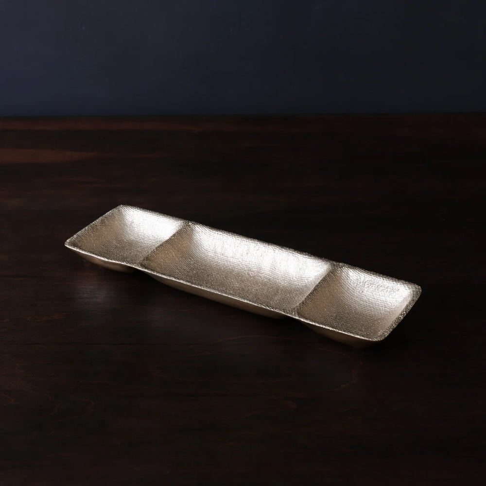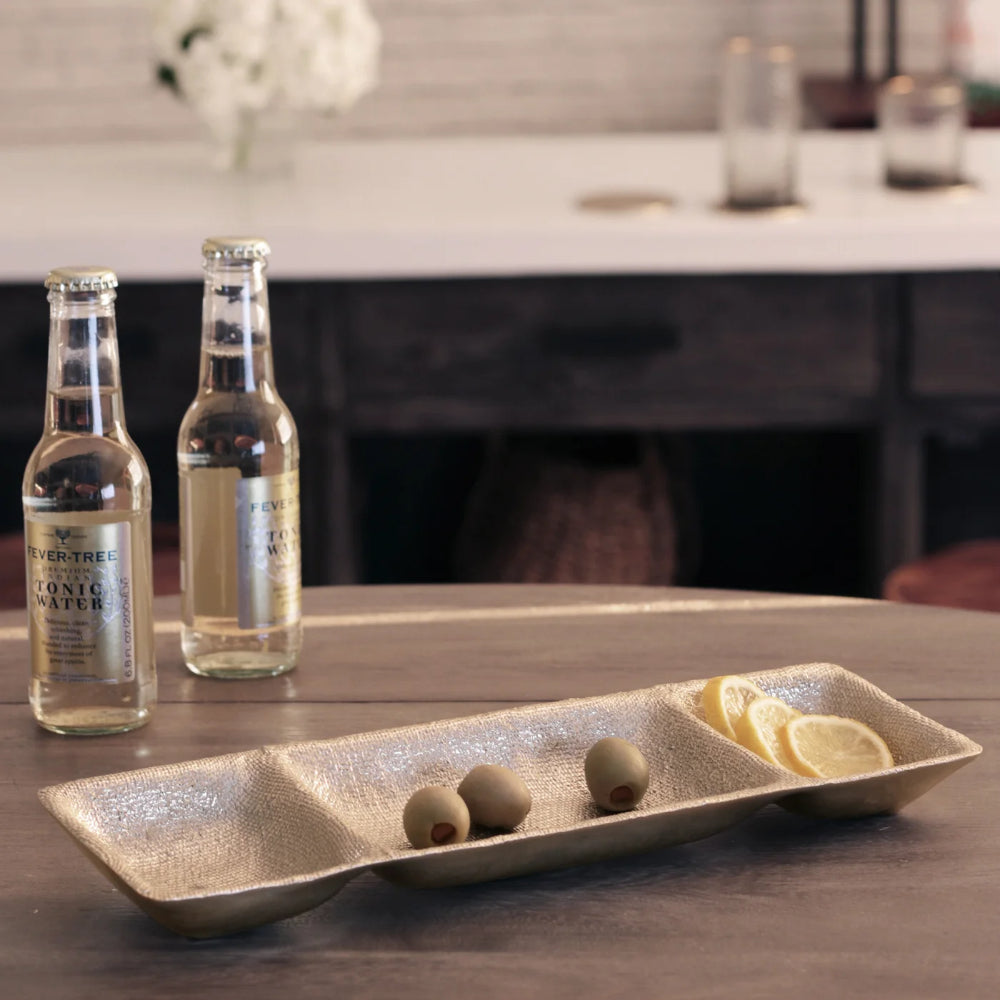 Its richly textured surface is made unique and fresh with a proprietary metallic gold finish that adds a hint of glam to any serving situation. The triple dip offers stylish design, with elegant practicality. A great piece with a fabric-inspired texture, and a brilliant metallic finish.