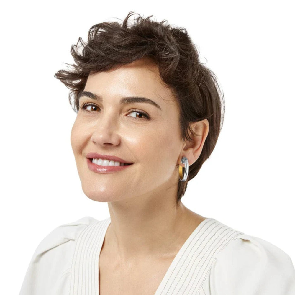 These hoop earrings with softly hammered details and golden accents is modern art-to-wear – breathtaking from every perspective.
