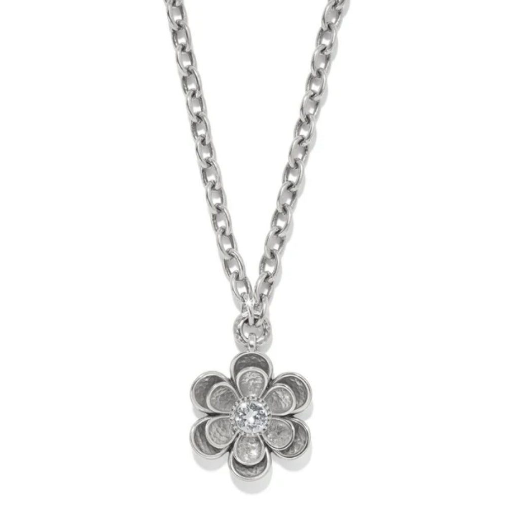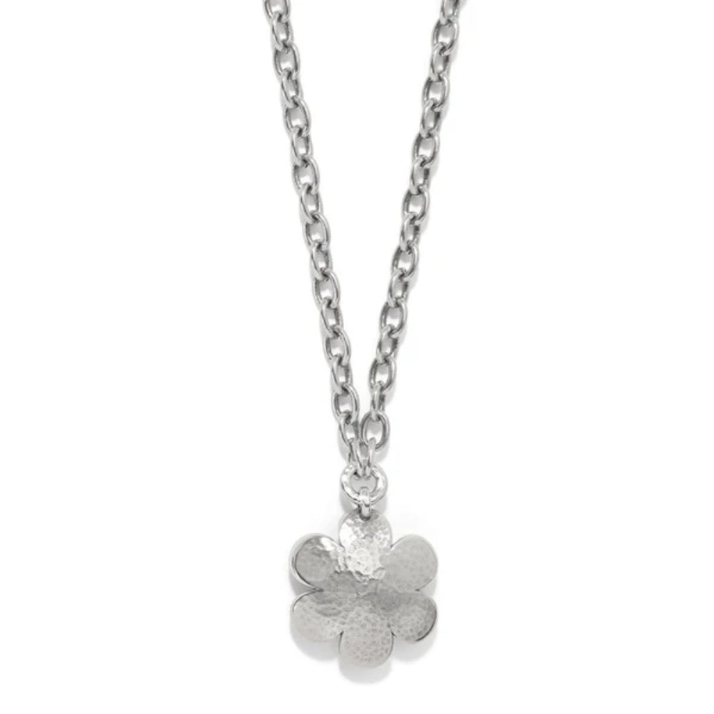 When our designer was in Bueno Aires, she saw a metal flower sculpture by the artist Eduardo Fernando Catalano and she loved the way the flowers had a “scooped” shape. That art inspired this pendant necklace with a silver double-stacked bloom and hand-hammered details.