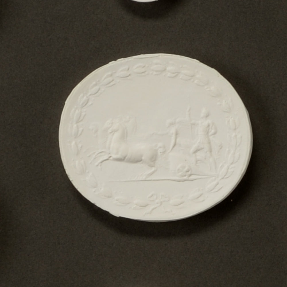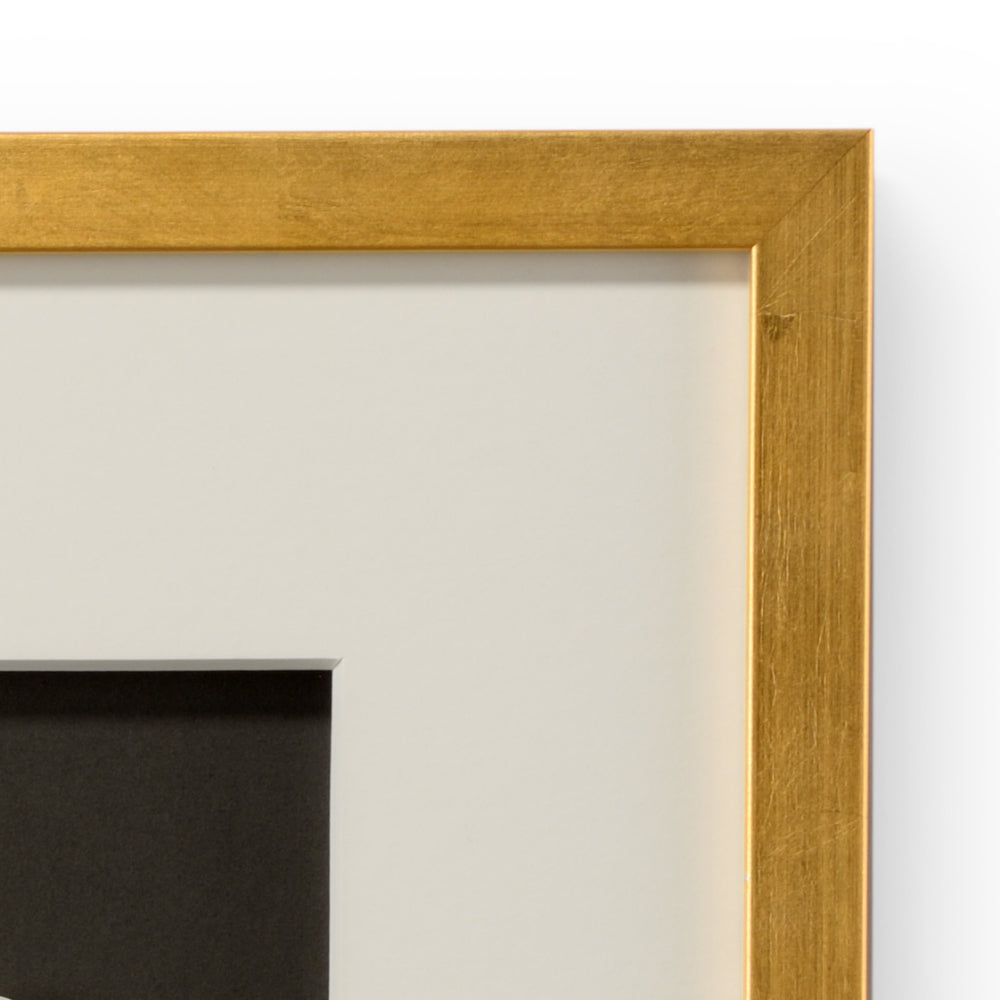 Intaglios on charcoal background mounted under glass in a contemporary gold leaf frame with a six ply white mat.