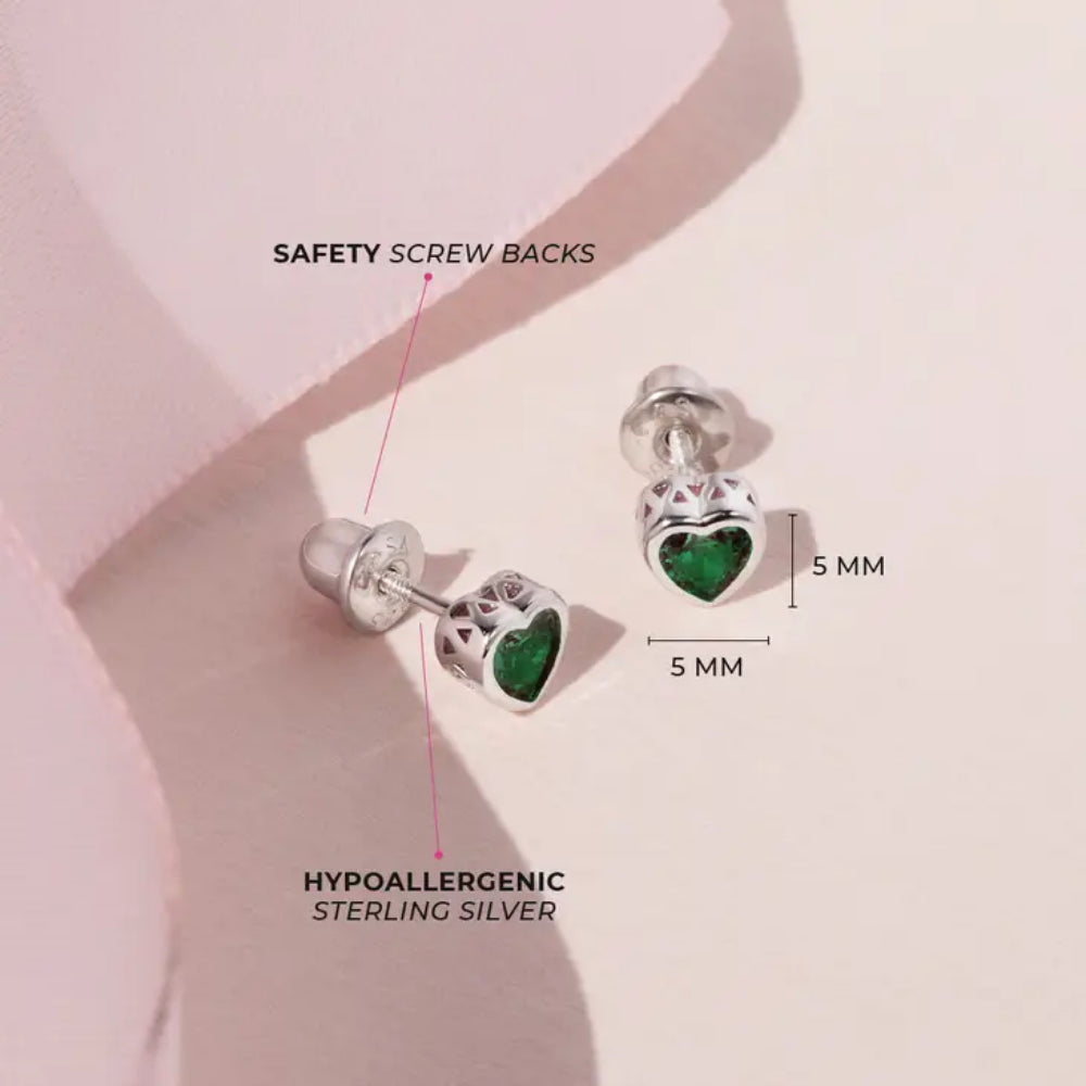 These adorable birthstone heart earrings for toddlers and little girls are made using quality cubic zirconia stones. The 5mm CZ heart is delicate, yet sophisticated for the perfect look, dressing up or down. They are crafted entirely of 925 sterling silver, a naturally hypoallergenic fine metal, making it safe for sensitive ears. They feature threaded posts and a safety back system to ensure your child's earrings stay comfortably in place.